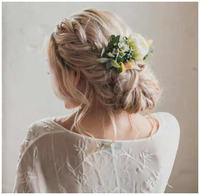 7. Low Bun with Flowers Ideal for garden or bohemian-themed weddings, adding faux or fresh flowers to your low bun can introduce a vibrant and natural aesthetic. This style is perfect for spring or summer weddings and adds a playful, romantic flair to your overall look.