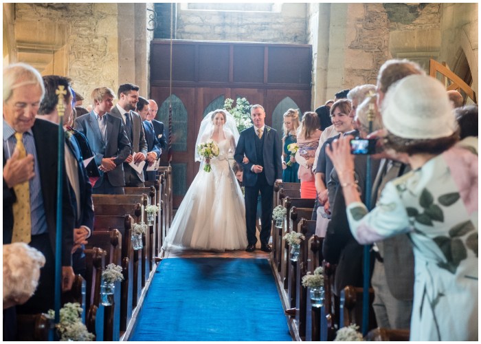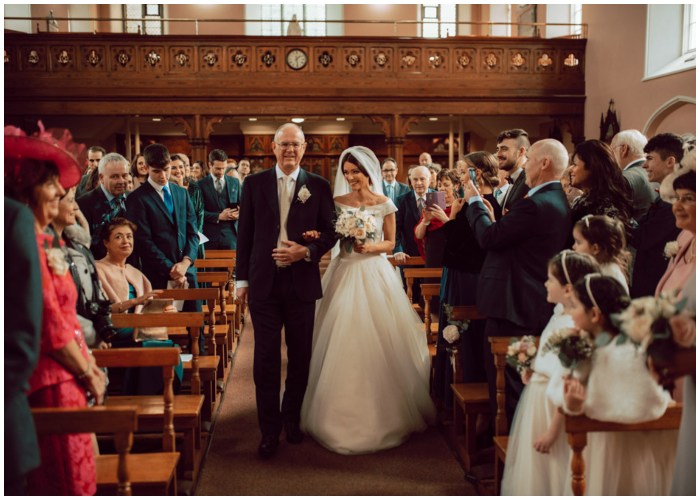 Walking down the aisle is your red carpet moment, so how you carry yourself matters. De Manio recommends holding your bouquet low to highlight the bodice of your dress and keep your posture elegant. Before walking, ensure your hair is neat and out of your eyes so your expressions are visible in photos. If you’re walking with an escort, coordinate beforehand to ensure you’re in sync. Uneven pacing or awkward steps can detract from the elegance of the moment. Brides walking with both parents should practice balancing the dynamic, as three people navigating the aisle together can feel tricky without preparation.