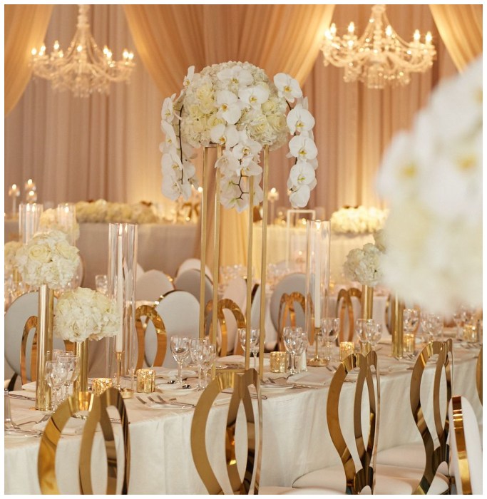 Gold continued to shine brightly in 2024, securing its place as the second-most popular wedding color, with 38% of couples incorporating it into their palettes. The allure of gold lies in its ability to add a touch of opulence and glamour to any setting. This metallic hue was particularly favored by those embracing the “old money” wedding trend, where elegance and grandeur took center stage. Gold accents were often paired with neutral tones like cream and black, creating a luxurious and sophisticated atmosphere. From gold-rimmed glassware to gilded invitations and shimmering tablecloths, this hue brought a sense of warmth and richness to wedding celebrations, making it a popular choice for couples looking to elevate their decor.